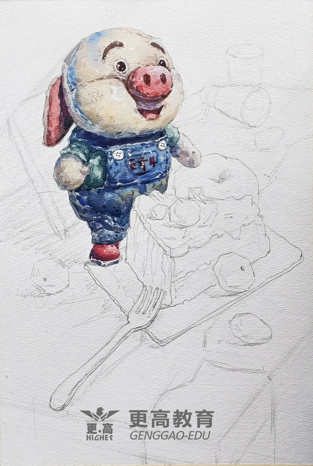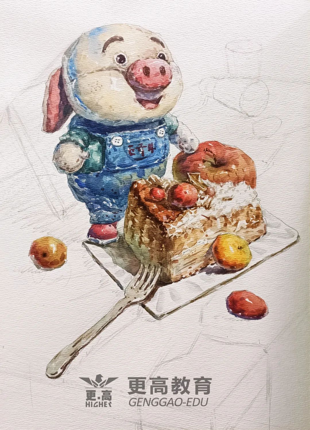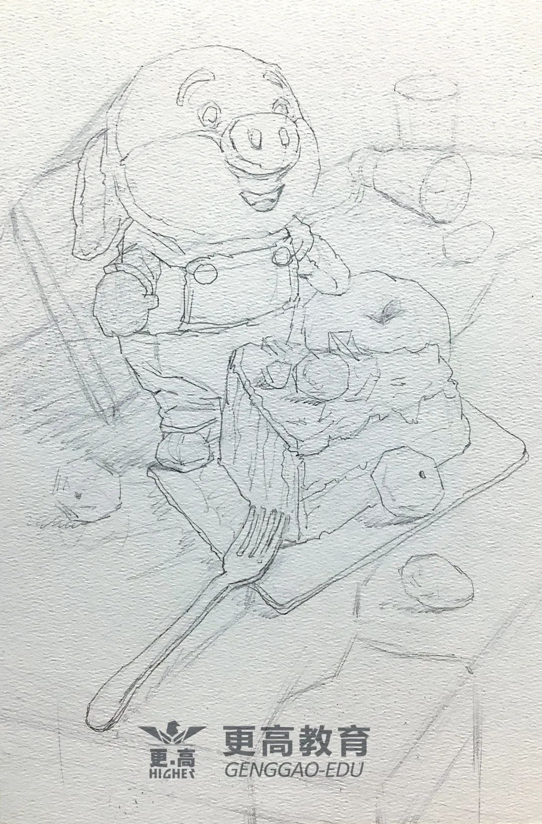第一步:用鉛筆把靜物的外輪廓勾好,水彩的形一定要勾的準一些,方便后期上色,用鉛筆大致區分一下亮灰暗面和投影,方便后期上色。