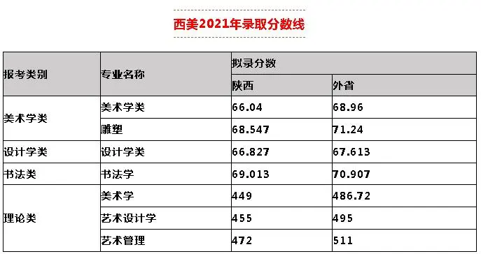 2021年西安美術(shù)學(xué)院各專業(yè)錄取分?jǐn)?shù)線: