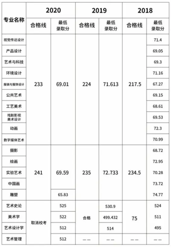 5.藝術(shù)學(xué)理論類(美術(shù)學(xué)、藝術(shù)史論、藝術(shù)設(shè)計(jì)學(xué)、藝術(shù)管理)專業(yè):美術(shù)與設(shè)計(jì)類專業(yè)省統(tǒng)考成績(jī)達(dá)到本科合格線,高考文化課成績(jī)達(dá)到所在省藝術(shù)類本科最低控制線,按文化課成績(jī)從高分到低分排序擇優(yōu)錄取,高考文化課成績(jī)相同按位次排序錄取。要求語文單科成績(jī)不低于90分(按滿分150分計(jì)算,滿分不是150分的折算成150分)。